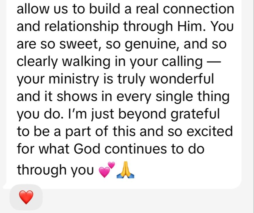 - Appreciates accountability to keep her motivated during seasons where it feels hard to stay committed to reading the Bible or show up to church.